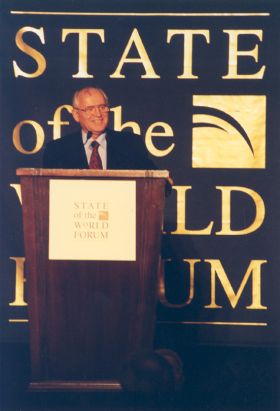 «Форум о состоянии мира» (State of the World Forum) был учрежден в 1995 году. Первый форум прошел в том же отеле Fairmont в сентябре 1995 года. Второй форум (октябрь 1996) открылся 2 октября - в день рождения Махатмы Ганди - и продолжался пять дней. К моменту выступления в мире разворачивались дискуссии о расширении НАТО на Восток, тлели конфликты на территории бывшей Югославии. Форум проходил в условиях первого президентства Клинтона и нараставших споров об однополярном мире и роли США как единственной сверхдержавы.